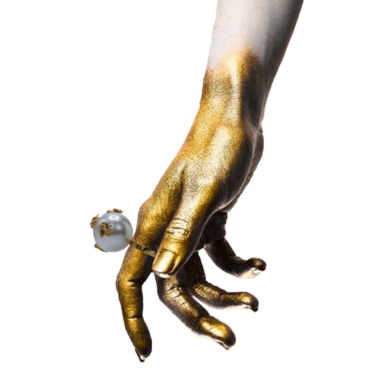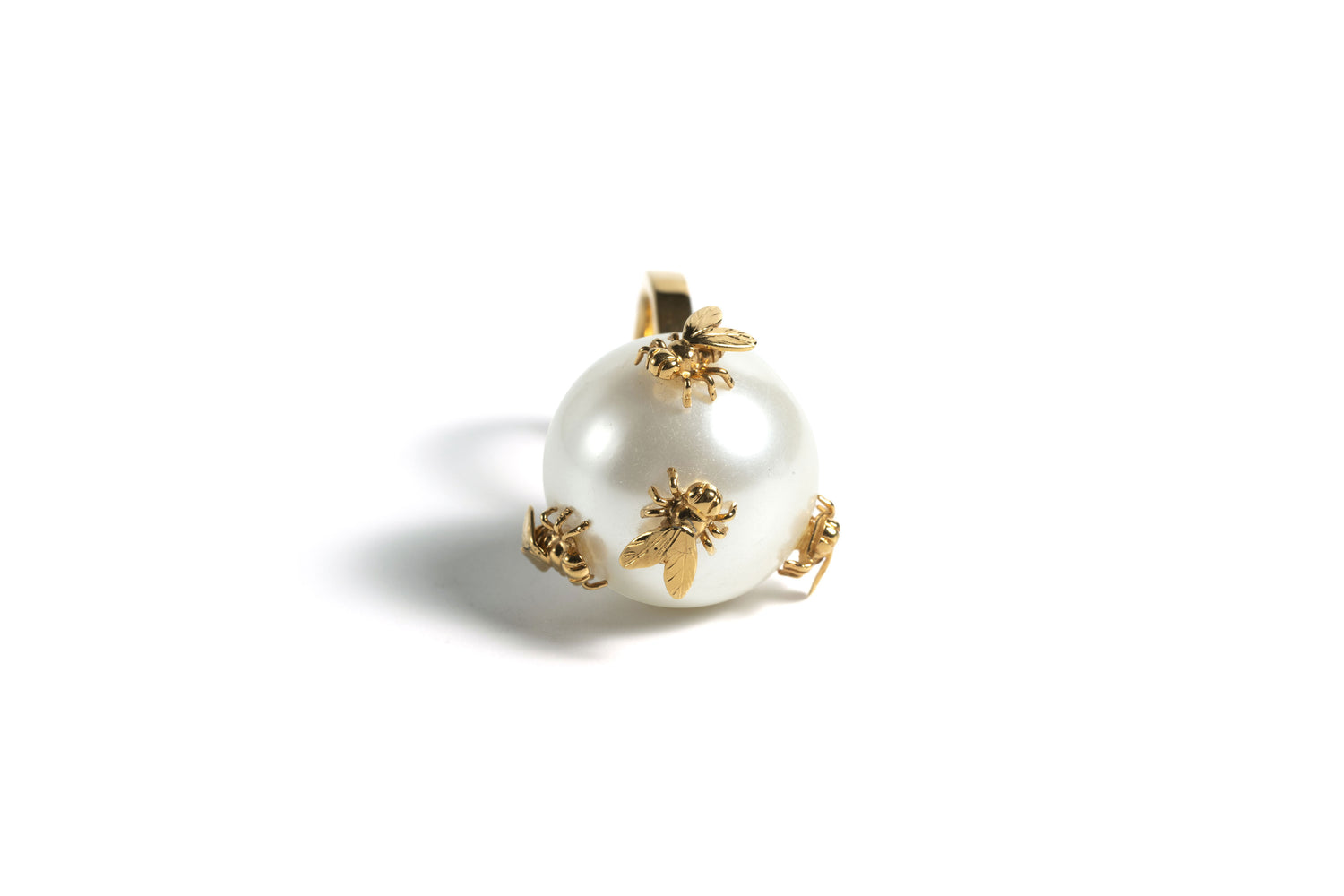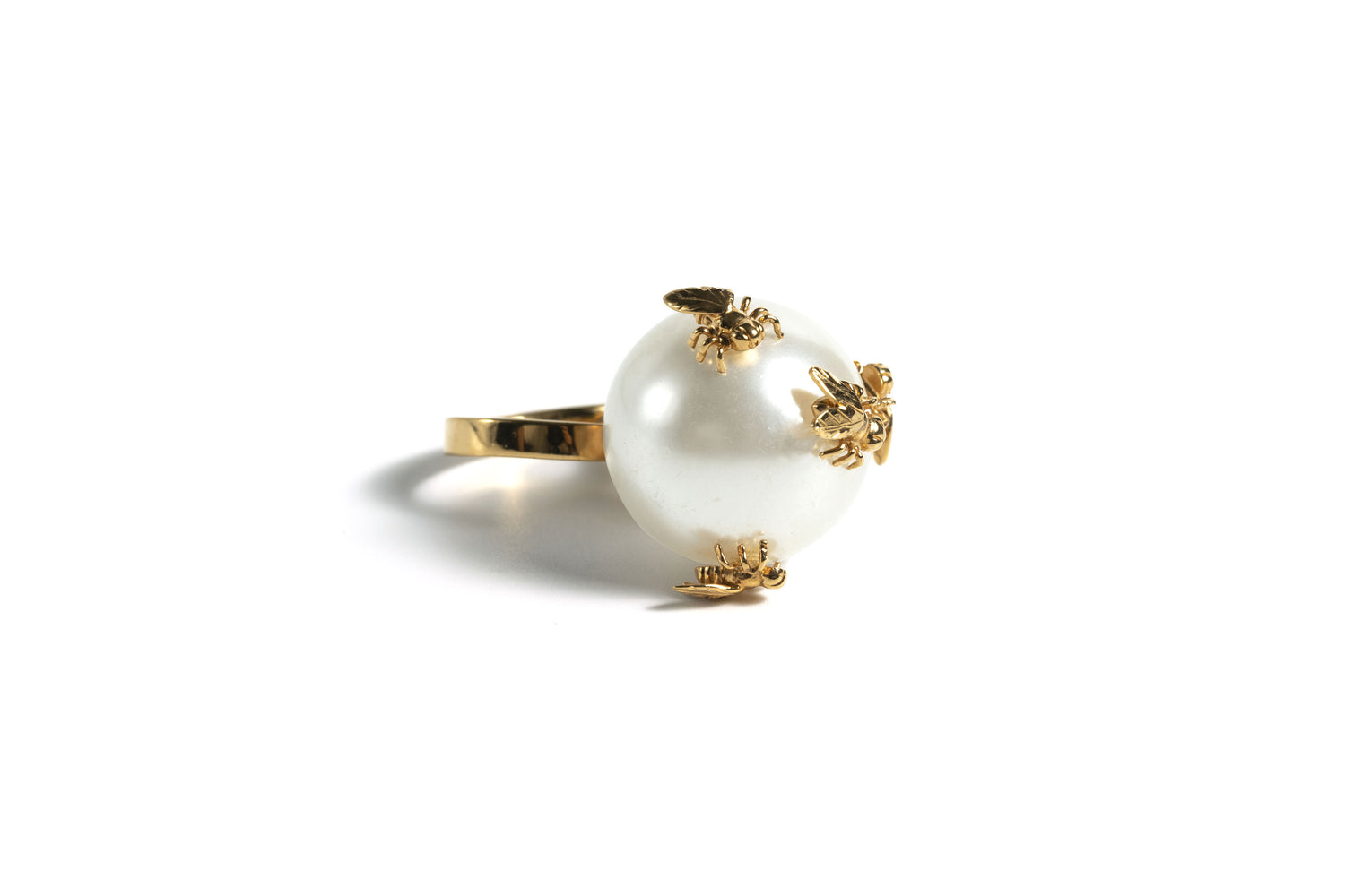 Anillo de perla mediana de cristal con 4 moscas realizada en material de liga (aleación de metales).