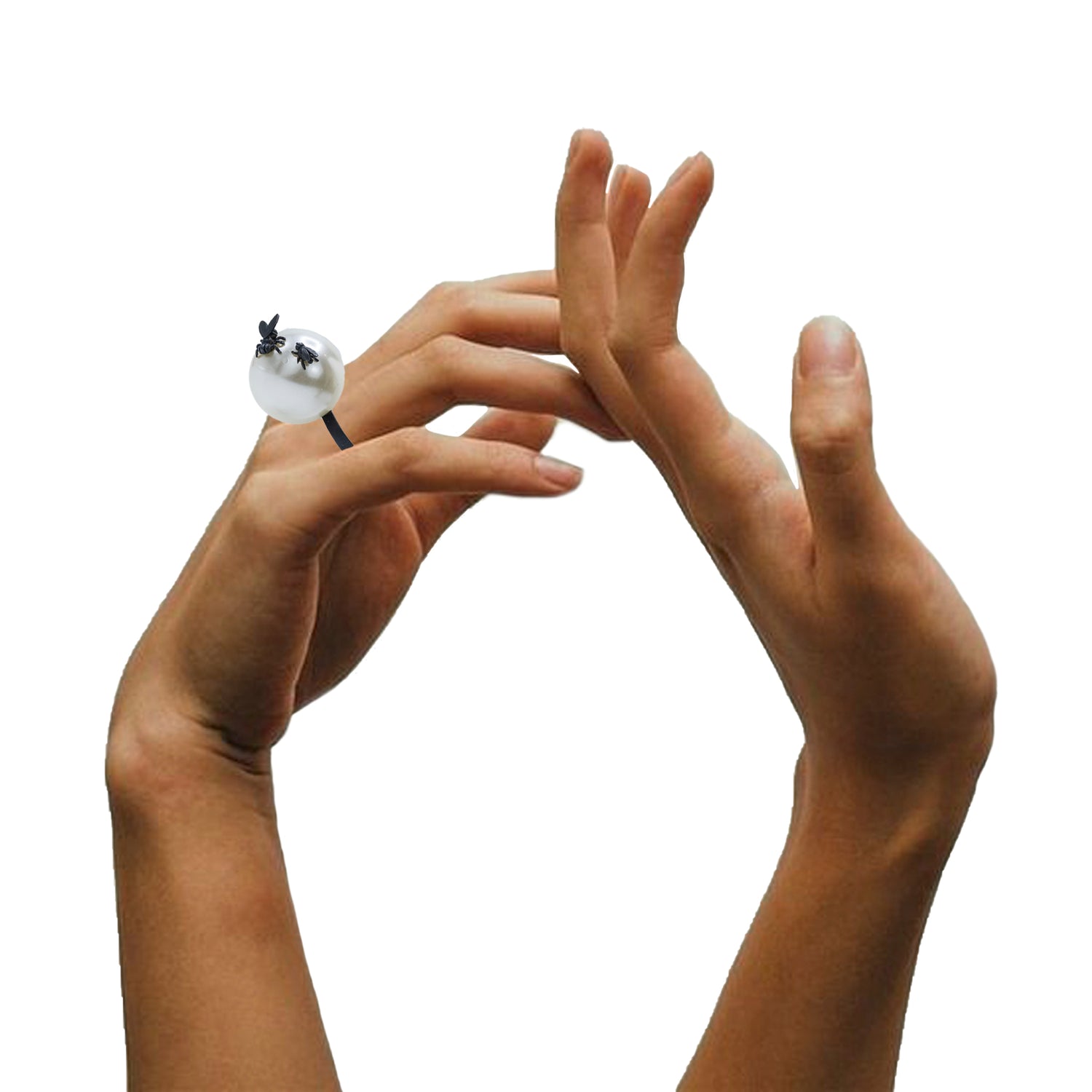 Anillo de perla de abulón con dos moskas realizadas en plata pavonada (negra).