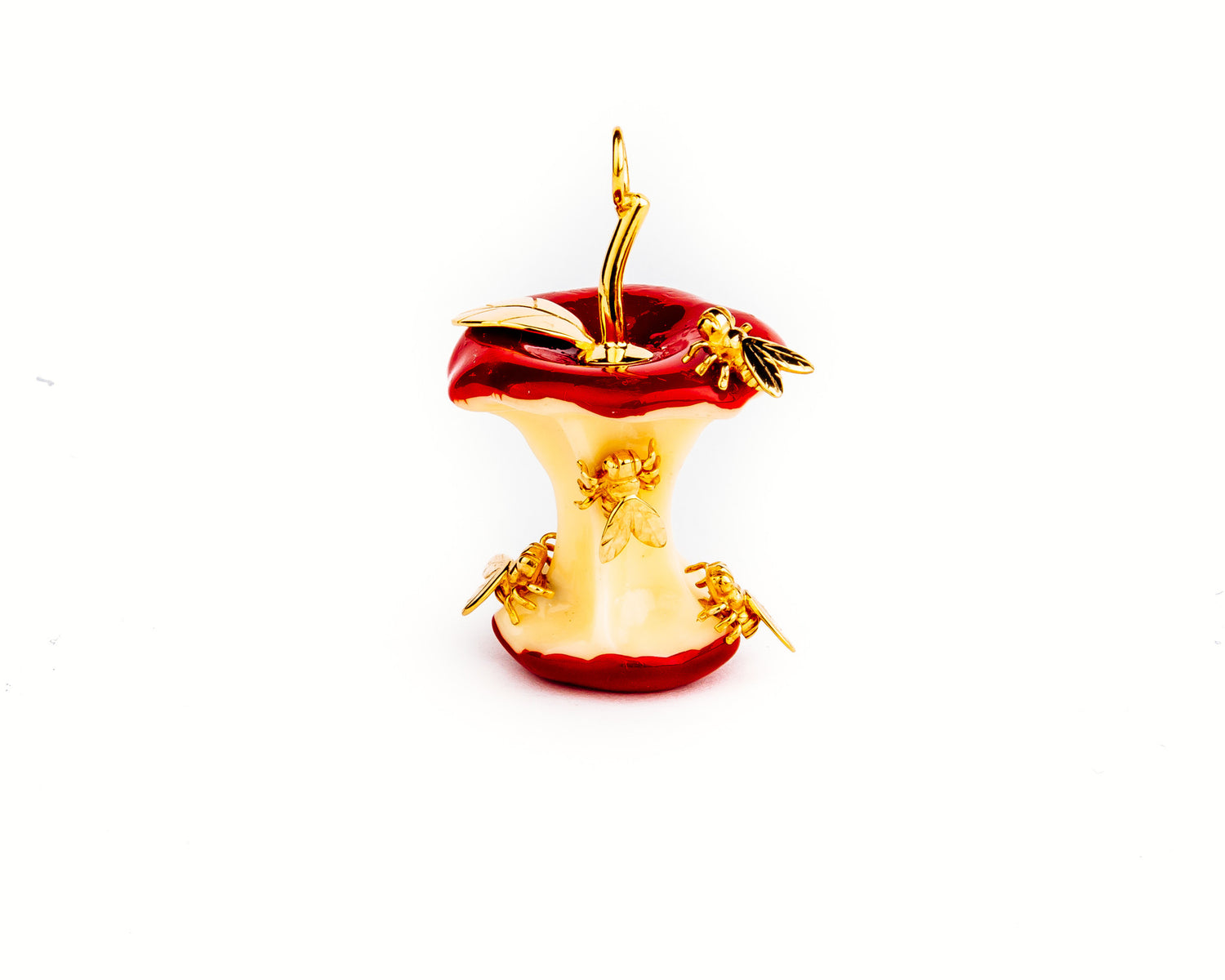 Apple pendant made of enameled resin with four flies, steam and leaf made wiht 14K gold.