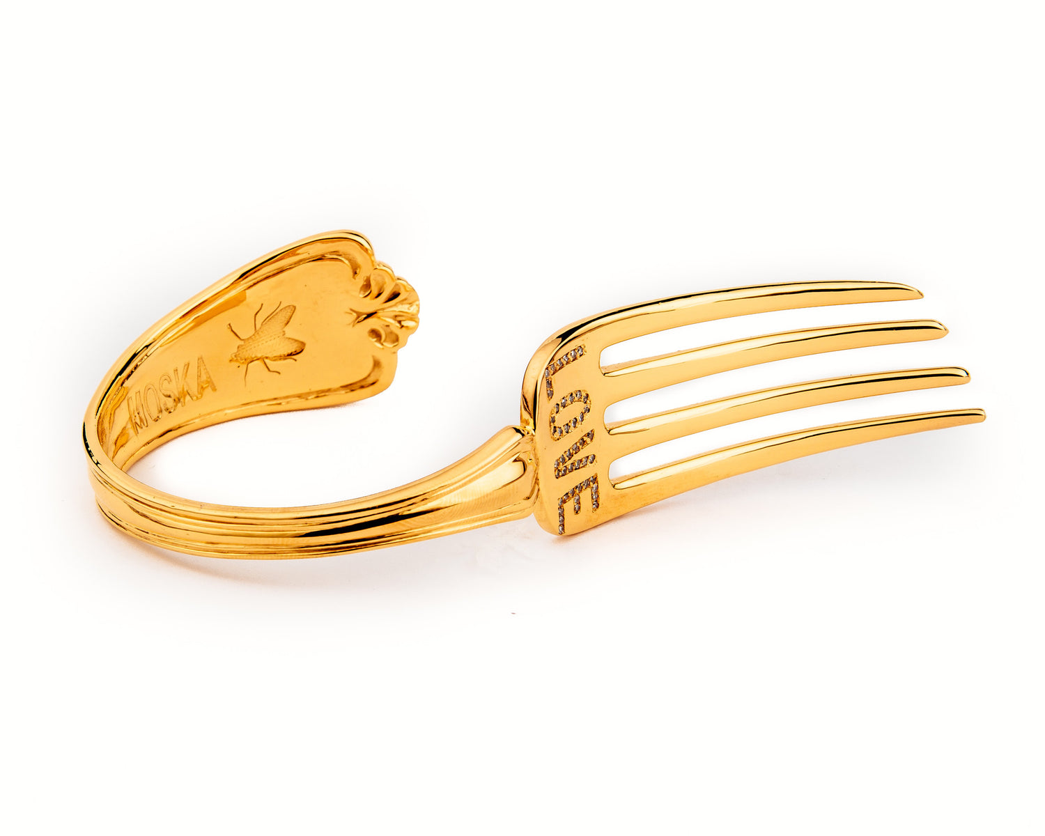 Pulsera de tenedor realizada en material de liga con letras en brillantes.