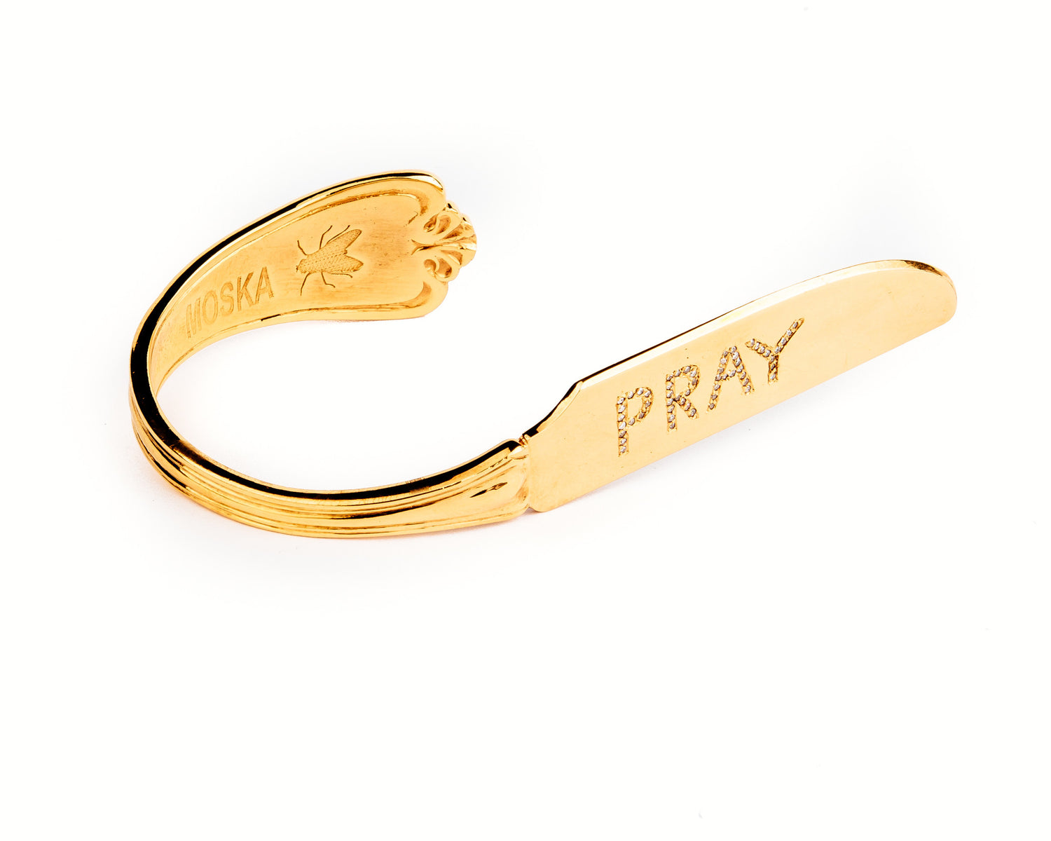 Pulsera de cuchillo realizada en material de liga con letras en brillantes.