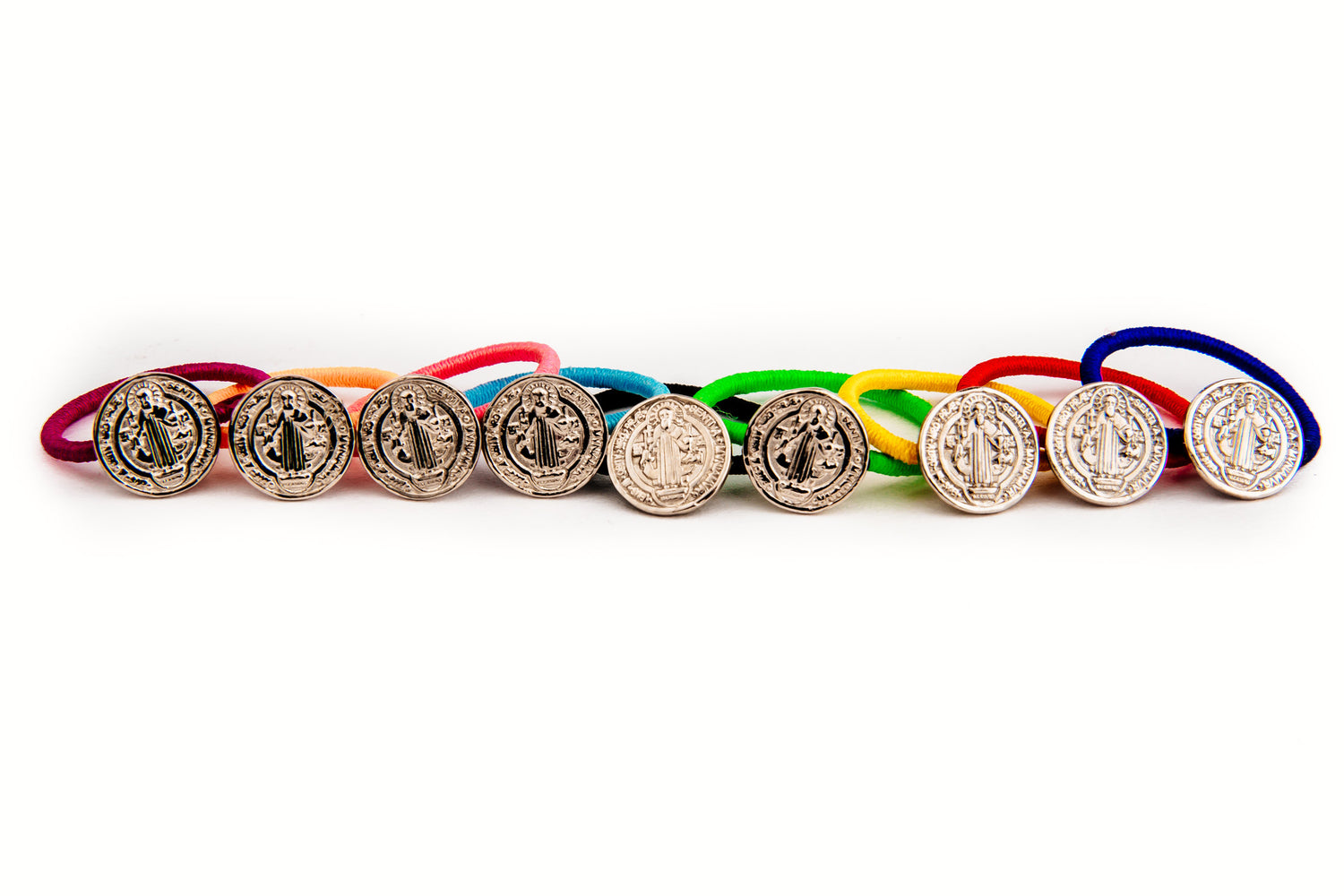 Elastic cord ring with a silver Saint Benedict made of liga material.