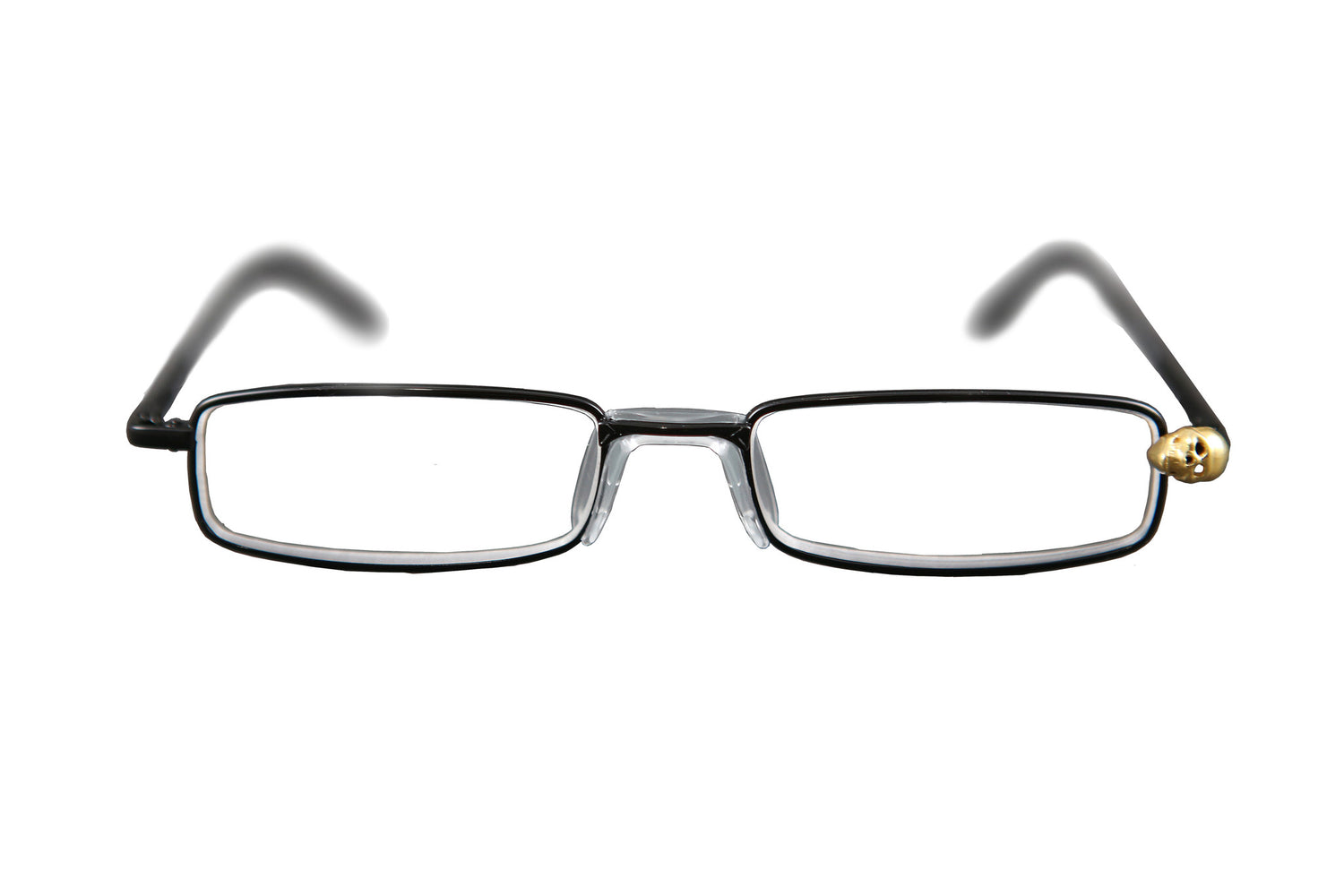 Prescription lenses with black frame and medium golden skull.