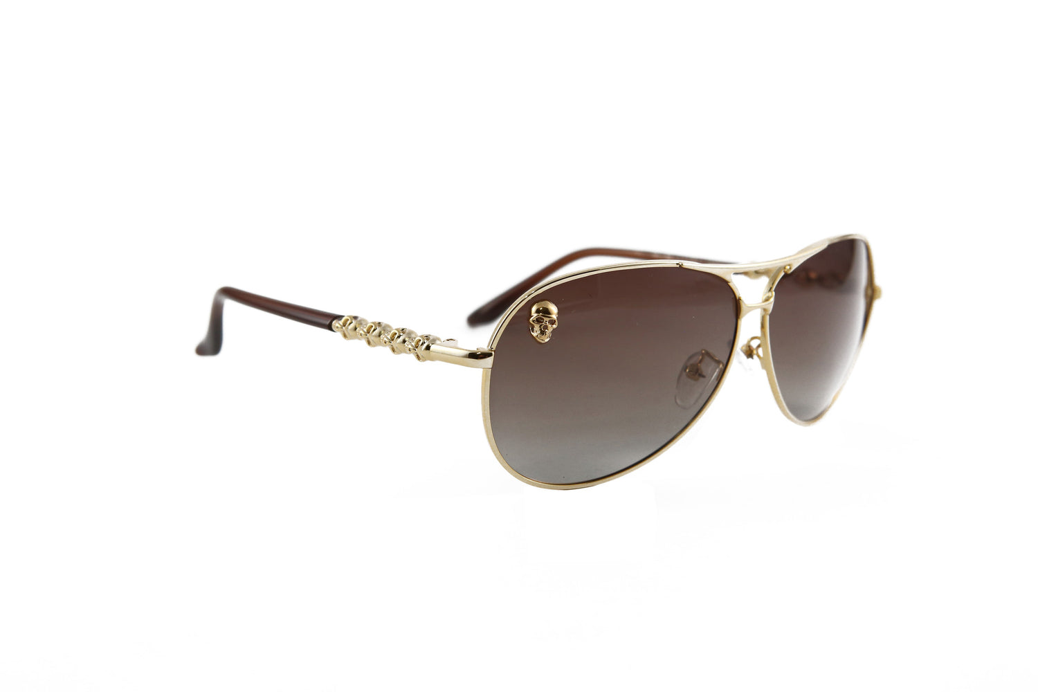 Lentes con montura dorada, cristal de color café con skull de tamaño M dorada y skulls en la patilla.