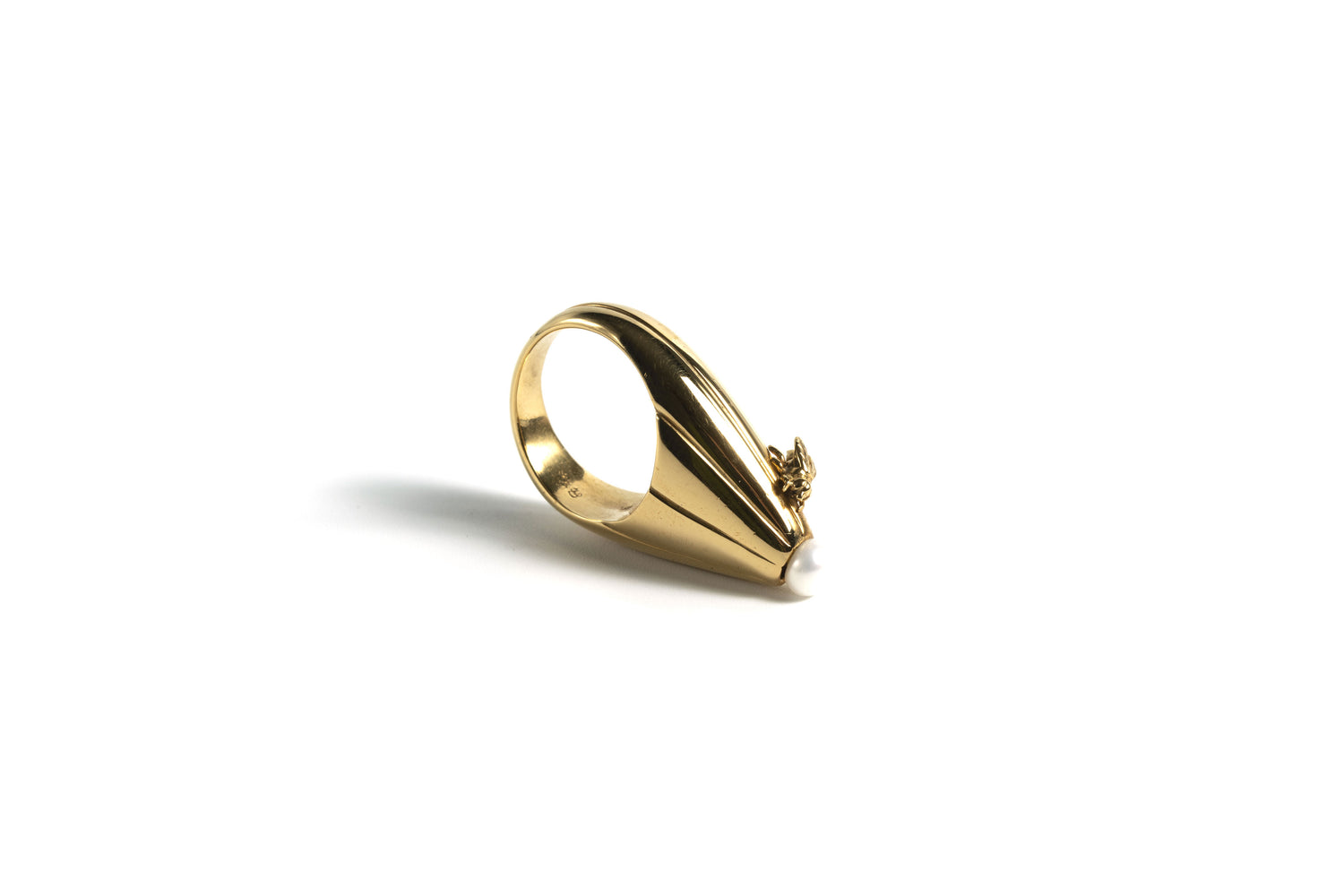Anillo de forma triangular con perla en el extremo y una mini moska realizado en material de liga (aleación de metales).